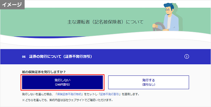 ウェブサイトからお見積りへ進んでいただき、「主な運転者(記名被保険者)について」の画面にて以下の質問で「発行しない」を選択いただくと、「保険証券不発行特約」がセットされます。