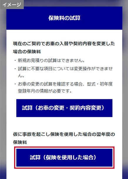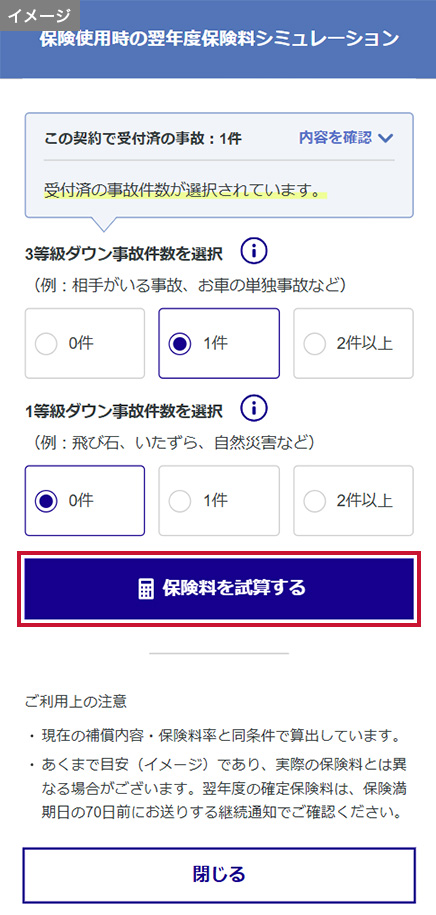 試算結果はあくまで目安(イメージ)であり、実際の保険料とは異なる場合がございます。また、ご契約状況や事故の件数によっては本機能の利用ができない場合がございます。