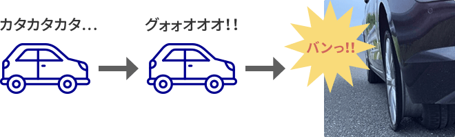 次第にグォォオという激しい音へ変わり、次の瞬間にはバンっ!という破裂音とともにハンドルのコントロールが効かなくなりました。