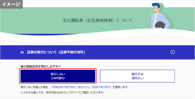 ウェブサイトからお見積りへ進んでいただき、「主な運転者(記名被保険者)について」の画面にて以下の質問で「発行しない」を選択いただくと、「保険証券不発行特約」がセットされます。